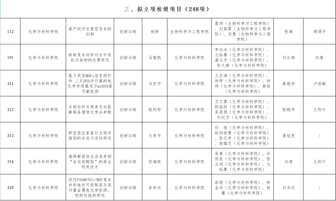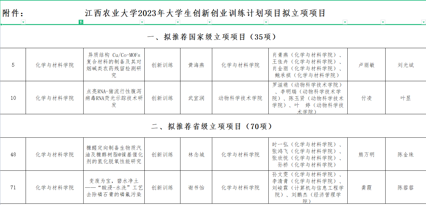 2023年4月8日,学校公布了2023年大学生创新创业训练计划项目评审结果,学校评审出国家级项目35项,省级项目70项,校级项目248项。beat365官网共有18个项目参与申报,11个项目获得立项,其中,国家级2项,省级2项和校级7项。卢丽敏和付凌老师获得国家级立项,熊万明和龚霞老师获得省级立项,张琳、刘长相、高艳莎、张晓华、聂旭亮、刘倩和刘书武7位老师获得校级立项。