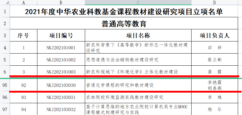 2022年12月5日,根据《关于开展2018年度中华农业科教基金教材建设研究项目结项暨2021年度中华农业科教基金课程教材建设研究项目申报工作的通知》《中华农业科教基金课程教材建设项目管理办法》及《中华农业科教基金课程教材建设研究项目评审办法》,中华农业科教基金会组织专家评审,146个普通高等教育项目准予立项,其中重点项目12个。beat365官网龚霞教授的“新农科视域下《环境化学》立体化教材建设”获得重点项目立项,李艳霞老师的“普通化学课程的研究和教材建设”获得立项。