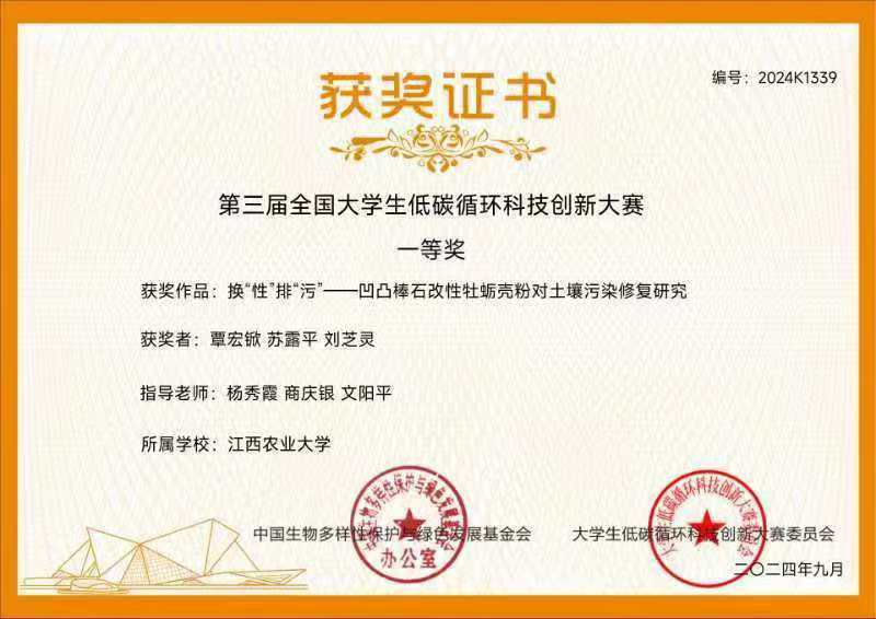 据悉,文阳平老师参与指导的“性”排“污”-凹凸棒石改性牡蛎壳粉对土壤污染修复研究在本次大赛中荣获一等奖,胡飞扬、龚磊老师指导《农林生物炭基催化剂的构筑及其催化二氧化碳甲烷化的机制研究》荣获二等奖,熊万明、吴苏琴老师指导《桐子壳炭基固体酸催化餐饮废弃油转化生物柴油》荣获三等奖本次比赛经评委专家初赛网络评审和决赛现场答辩,在激烈的竞争中脱颖而出,取得了优秀成绩。