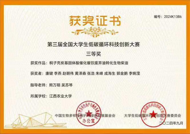 2024年9月10日,由中国生物多样性保护与绿色发展基金会(国家一级学会)主办的第三届大学生低碳循环科技创新大赛圆满落幕。beat365官网教师指导的项目团队在本次大赛中表现突出,在本科生组--实验研究类赛道中荣获一等奖1项、二等奖1项、三等奖1项。