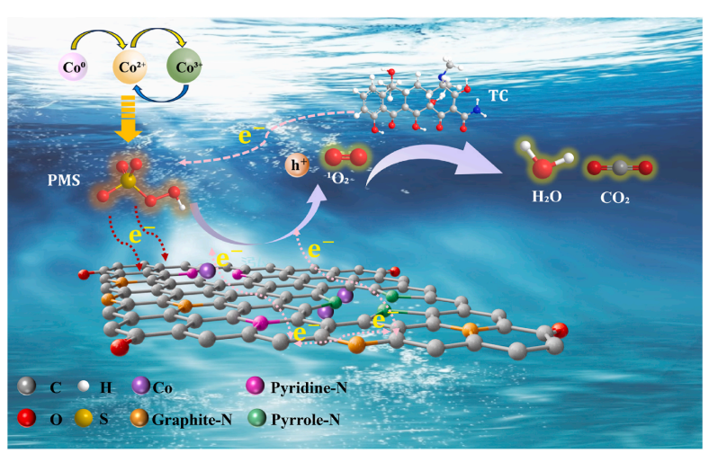 在废水污染物处理领域,光催化技术实现清洁水回收与高效污染物降解仍是重大挑战。开发高性能碳基催化剂被视为破解这一难题的关键。为此,我们利用层状双氢氧化物CoAl-LDH的层间限制效应,设计开发了双功能光热催化剂(氮掺杂碳催化剂),并将其应用于过氧单硫酸盐(PMS)介导的抗生素污染物降解及太阳能界面水蒸发。如预期所示,受限氮掺杂碳(CNC-10)的独特结构显著增强了石墨氮/吡啶氮/C=O活性位点的光热转化能力。具体而言,该CNC-10催化剂在PMS介导的四环素降解中表现出优异性能,60分钟内实现近100%去除率,其反应速率常数(k)达0.10985 min-1,是原始NC材料(0.0075 min-1)的14.6倍。此外,该催化剂还展现出4.72 kg m-2⋅h-1的显著太阳能界面水蒸发能力,远超其他同类碳基材料。不同操作条件下的实验结果进一步证实,该双功能体系对多种水环境具有优异稳定性,彰显了其在实际应用中的广阔前景。总体而言,基于PMS的氧化与太阳能界面水蒸发相结合的技术,在持续且高效地生产清洁水方面展现出巨大的应用潜力。