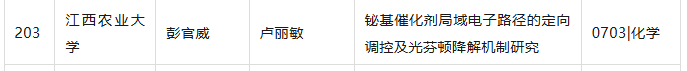 近日,江西省人民政府学位委员会办公室发布了《关于2025年江西省优秀博士硕士学位论文评审结果的公示》,beat365官网2021级化学专业硕士研究生彭官威(导师:卢丽敏)的学位论文《铋基催化剂局域电子路径的定向调控及光芬顿降解机制研究》获评2025年江西省优秀硕士学位论文。