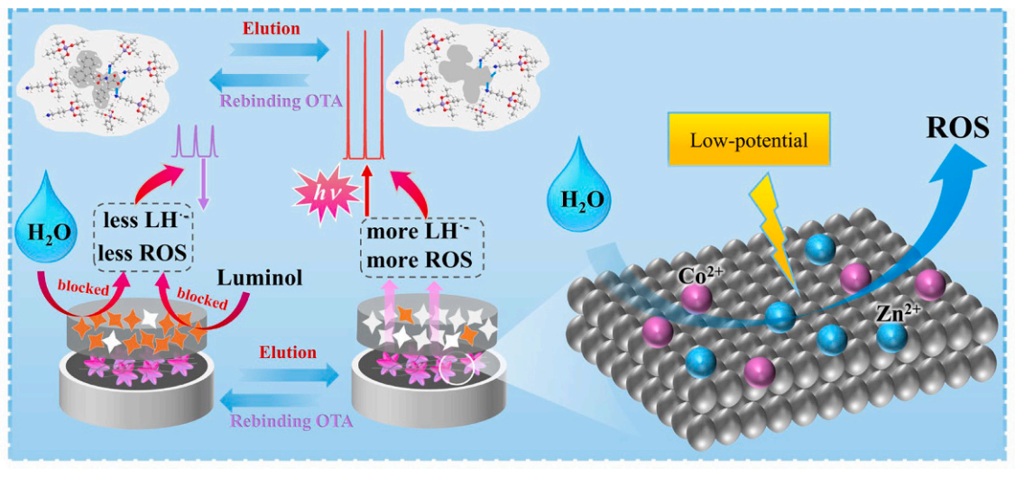 近年来,鲁米诺-水(Luminol-H2O)电化学发光(ECL)体系因其能克服传统共反应剂的固有缺陷(具体为过氧化氢的自分解和溶解氧的低溶解度)而备受关注。然而,该体系仍面临触发电位高的问题,这导致电极表面大量氧气(O₂)气泡聚集,进而造成 ECL 信号不稳定。在此,我们提出了一种针对 Luminol-H2O 体系的新型 ECL 增强策略,即利用多壁碳纳米管(MWCNTs)功能化的双金属钴锌沸石咪唑酯骨架(CoZn-ZIF)作为共反应促进剂。得益于协同作用,MWCNTs 修饰的 CoZn-ZIF(CoZn-ZIF@MWCNTs)在低电位(0.6 V vs. Ag/AgCl)下表现出优异的析氧反应(OER)活性,通过高效催化水分子转化为羟基自由基(⋅OH)和超氧自由基(O₂⋅⁻),从而实现了稳定且高强度的 ECL 信号。结合分子印迹技术,我们开发了一种用于检测赭曲霉毒素 A 的新型 ECL 传感器,实现了 0.023 nM (S/N = 3) 的检出限和 0.1–10,000 nM 的宽线性范围。在实际样品分析中,该传感器表现良好的回收率(99.30%–110.30%),证明了其高准确性。该工作不仅为提升鲁米诺 ECL 性能开辟了新途径,也为推动 ECL 传感技术在食品安全和环境监测领域的应用提供了新思路。