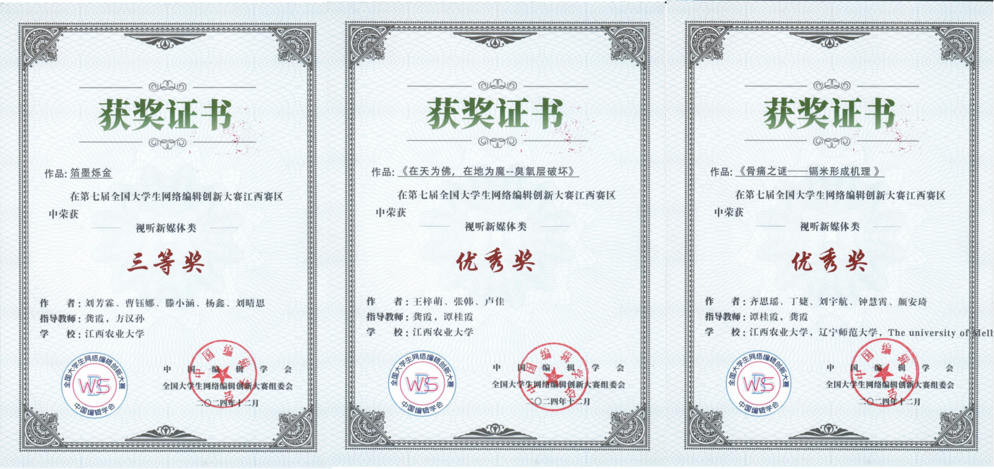 beat365官网教师指导的作品在第七届全国大学生网络编辑创新大赛江西赛区荣获3项奖。由龚霞、方汉孙老师指导的作品《箔墨烁金》获得三等奖;龚霞、谭桂霞老师指导的作品《在天为佛,在地为魔—臭氧层破坏》获得优秀奖;谭桂霞、龚霞老师指导的作品《骨痛之谜—镉米形成机理》获得优秀奖。