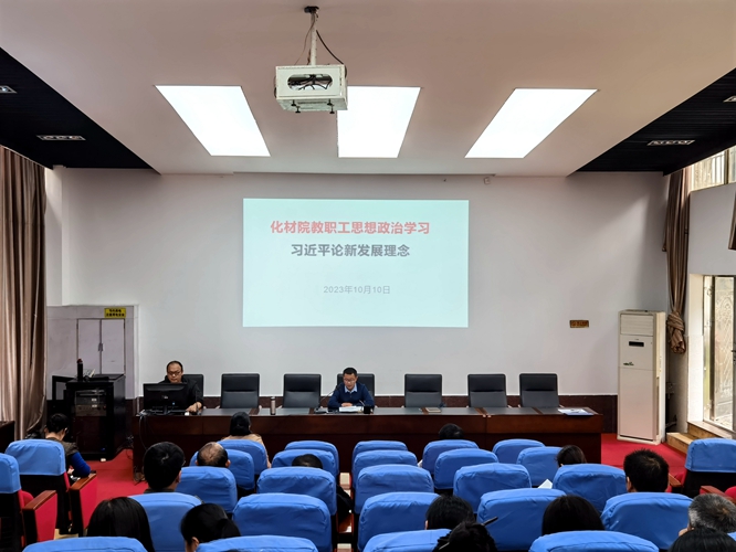 2023年10月10日14:30,学院在致学楼阶梯报告厅召开学院教职工大会,开展了教职工10月份思想政治学习。院党委书记刘庆言带领全体教职工一同认真学习了《习近平论新发展理念》内容。
