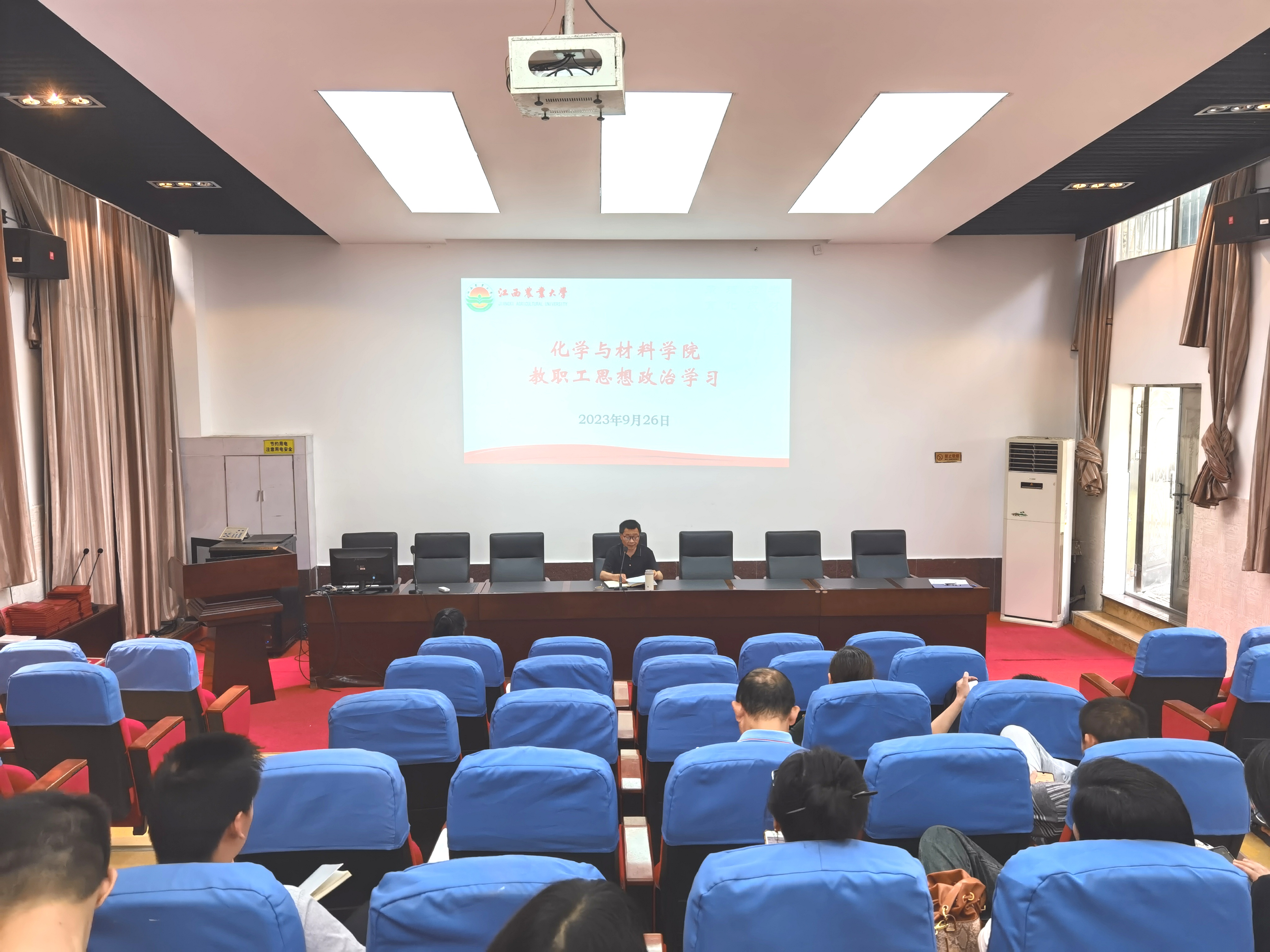 2023年9月26日14:10,学院在致学楼阶梯报告厅召开教职工大会,开展了9月份教职工思想政治学习。