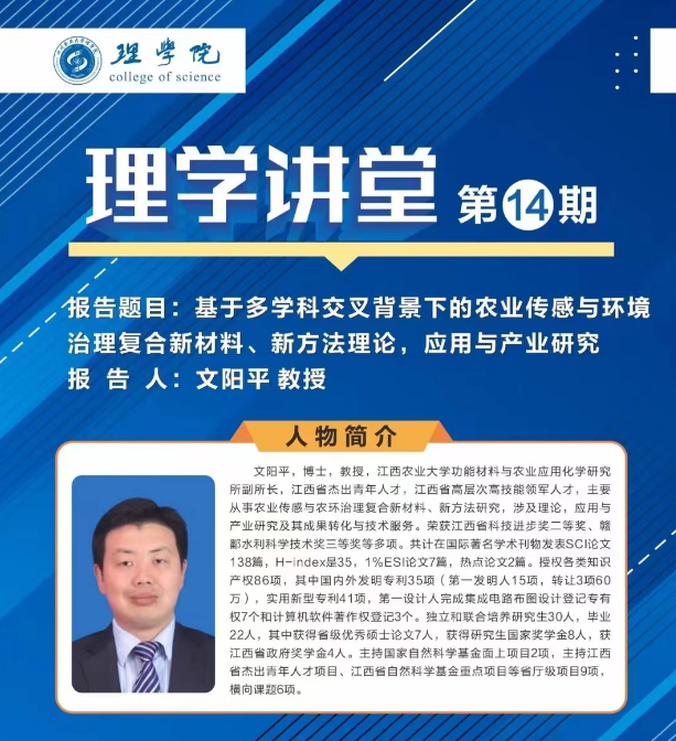 20231019日,材料与化工支部党员文阳平应邀到四川农业大学理学院进行学术交流,报告题目“基于多科交叉背景下的农业传感与环境治理复合新材料、新方法理论、应用与产业研究”。文阳平同志从事农业传感与环境治理复合新材料、新方法研究12年,包括农业传感快检,农业环境治理,农用复合新材料开发,农林废弃物利用,小型器件、设备合作研发与新产品产业化等方面,将自身研究方向与学校学科特色和江西地方特色融合,为新兴交叉学科提供广阔发展平台。报告内容获得四川农业大学理学院师生的一致好评。