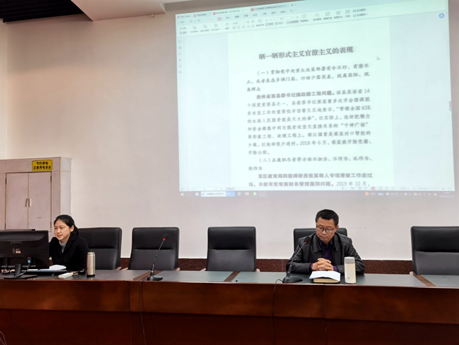 会上,学院党委副书记叶健带领全体教职工认真学习了校纪委、省监委驻校监察专员办公室下发的关于形式主义官僚主义的廉洁警示教育材料,特别是形式主义官僚主义表现的典型案例。