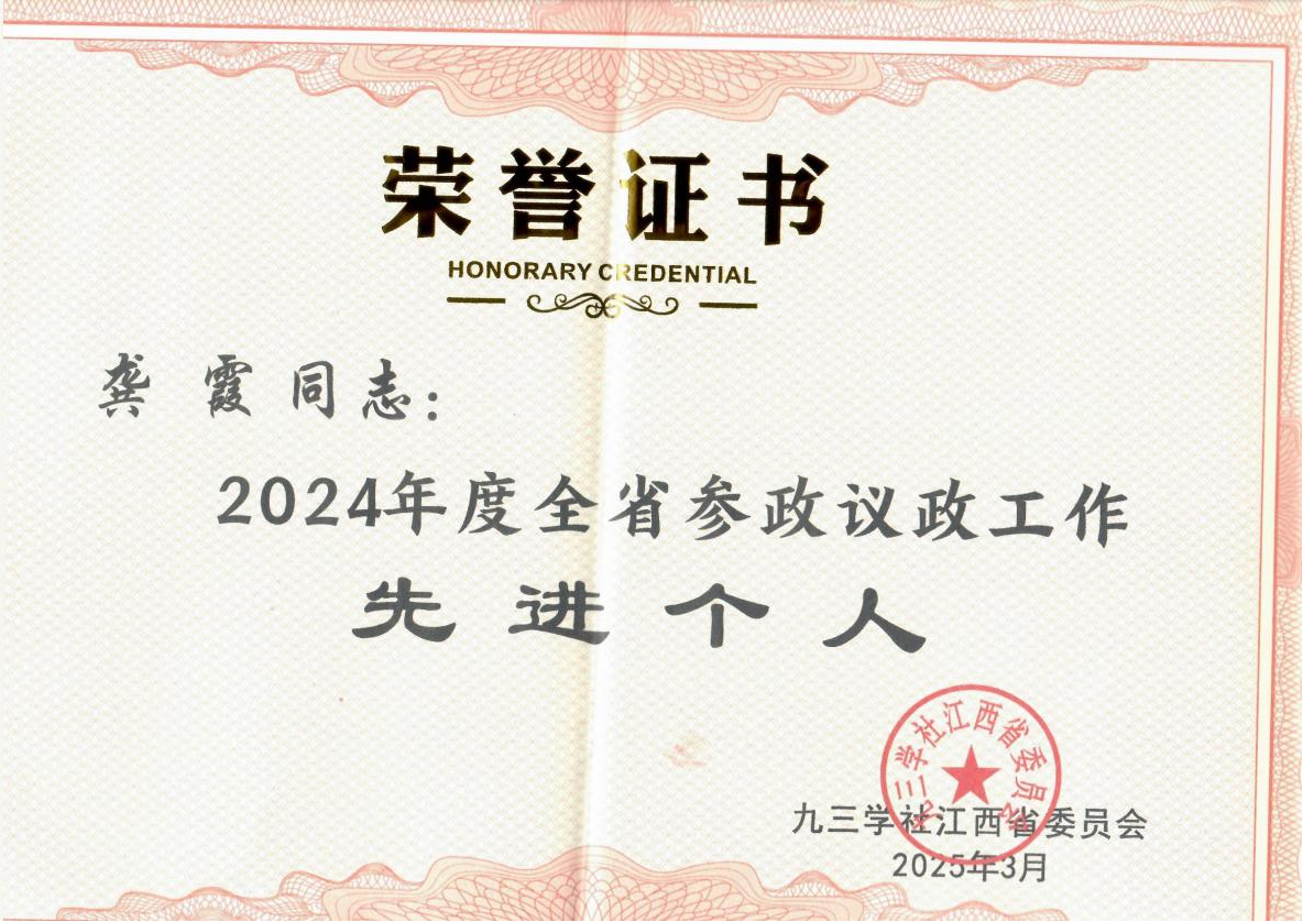 beat365官网龚霞教授获得2024年度九三学社江西省参政议政工作先进个人荣誉称号