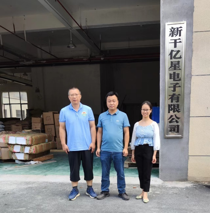 2023 年7月26日,为加强校企合作、推进“百博百企”项目进展和访企拓岗等工作,化学系支部党员贺雪梅博士和研究生支部党员黄喜根教授到新干亿星电子科技有限公司进行调研,总经理刘清辉亲自介绍了目前的生产销售情况及技术难点问题;双方就科技服务、合作研发、技术人员培训与培训职工能力提高等等主题充分发表意见,形成了一致认识,加快推进项目完成,并希望继续合作。