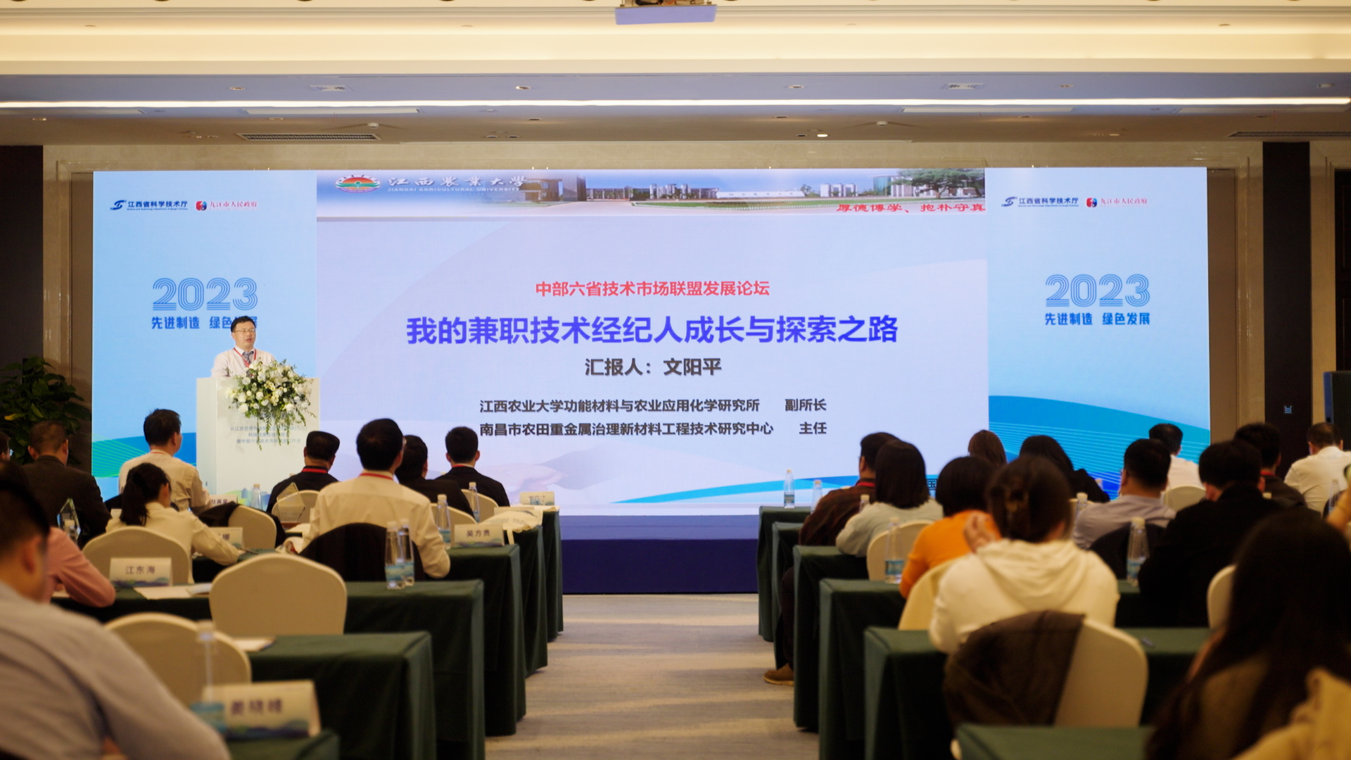 中部六省技术市场联盟发展论坛上,2023年度江西省技术经理人TOP10榜单发布并颁奖,其中,我校青年教授文阳平博士荣获江西省技术经理人TOP10榜首。会上,文阳平分享了他兼职技术经纪人成长与探索之路,通过典型案例分析如何做兼职技术经纪人及其成效,同时从成果需求方、供给方和技术经纪人服务方三个角度指出技术经纪人服务科技成果转移转化存在问题和解决办法,最后提出了“政产研服”四位一体技术经纪人新模式。