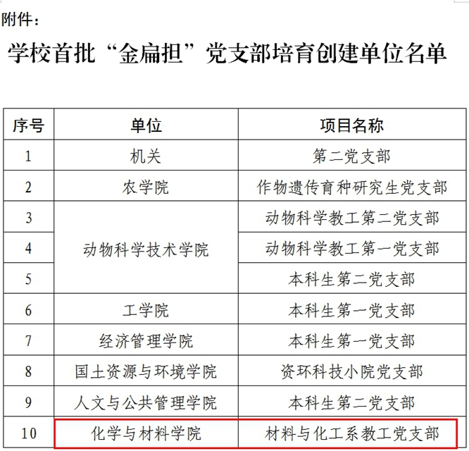2024年9月2日,学校党委组织部发布《关于公布学校首批“金扁担”党支部培育创建单位名单的通知》文件,材料与化工系教工党支部经自主申报、学院党委推荐、资格审查、专家评分、校党委组织部审议,从全校一众申报单位中脱颖而出,最终获批首批10个“金扁担”党支部培育创建单位之一。