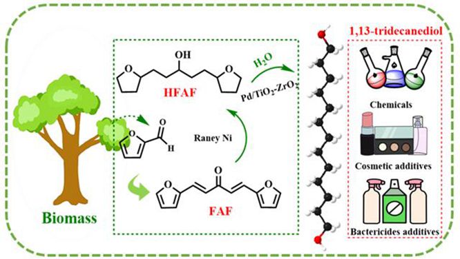 作为一种可再生的有机碳源,木质纤维素生物质因其储量巨大、成本低廉和可价值化而被认为是一种可持续生产化学品或燃料的具有前景的替代原料。基于此,该工作以生物质平台分子糠醛为原料,通过与丙酮的羟醛缩合反应首先合成C13化合物(FAF),随后在Raney Ni催化剂和Pd/TiO2-ZrO2催化剂的作用下逐步加氢脱氧(HDO)选择性合成1,13-十三烷二醇(TDOL),实现了糠醛的价值化。与传统TDOL合成工艺相比,该三步法策略不仅能够有效避免工艺复杂、成本较高等问题,而且建立了生物质平台分子糠醛与高价值化合物TDOL的联系,这与为生物质资源的价值化提供了一条新的途径。