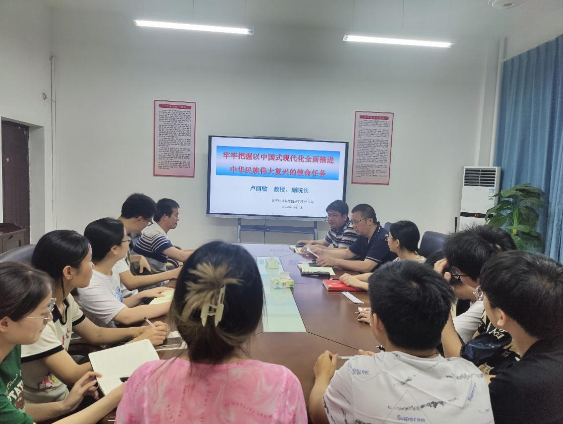 为深入学习贯彻党的二十大精神,推进主题教育走深走实,2023年6月119:40,党委委员、学院副院长卢丽敏教授为研究生支部党员讲授题为《牢牢把握以中国式现代化全面推进中华民族伟大复兴的使命任务》的专题党课。
