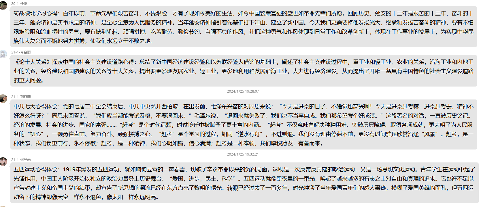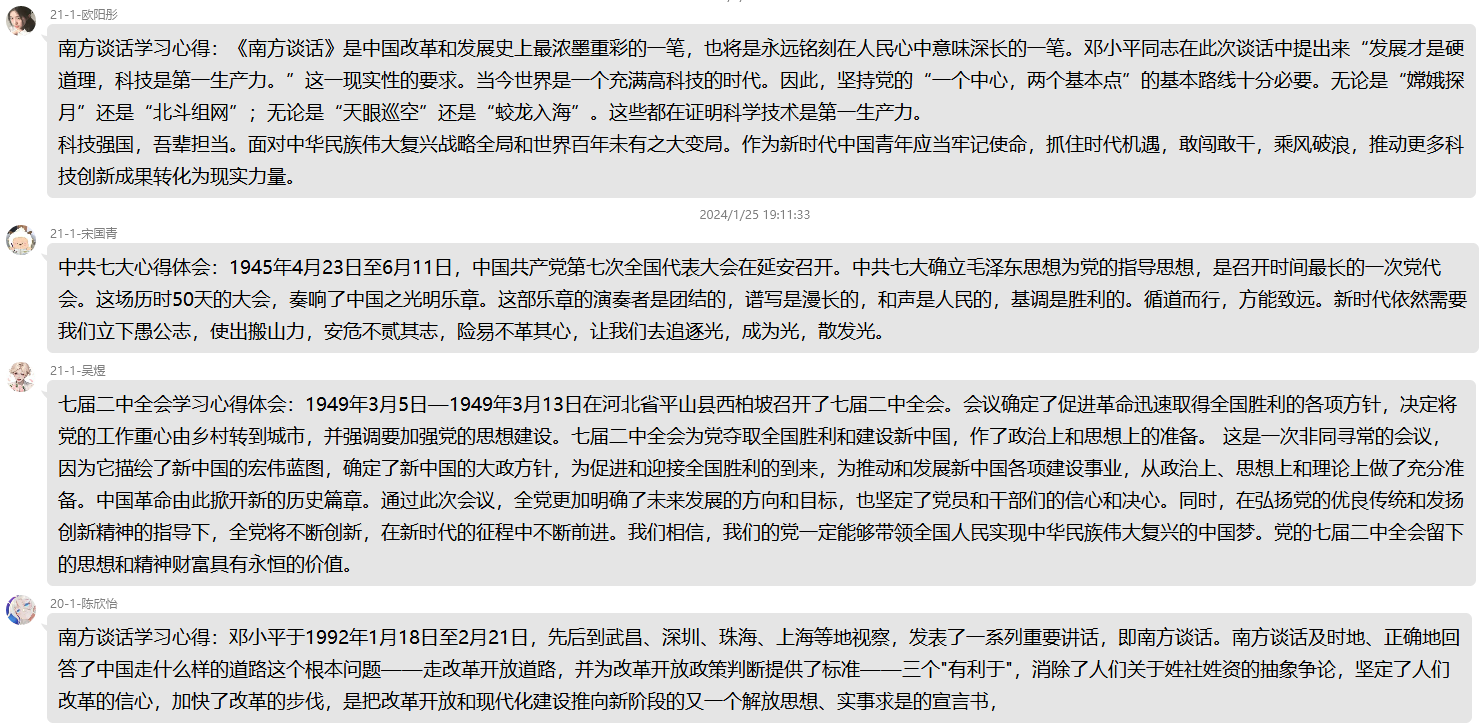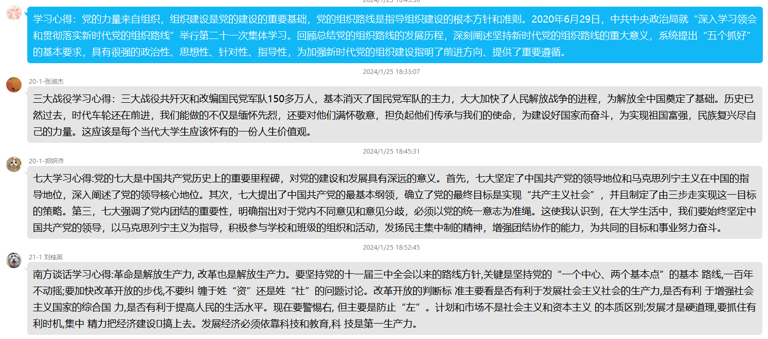 2024年1月25日至26日,本科生第一党支部开展线上主题党日活动,同学们通过学习强国APP自学,并在支部群里讨论和发表心得体会,真正做到了放假不停学,时刻保持先进性。