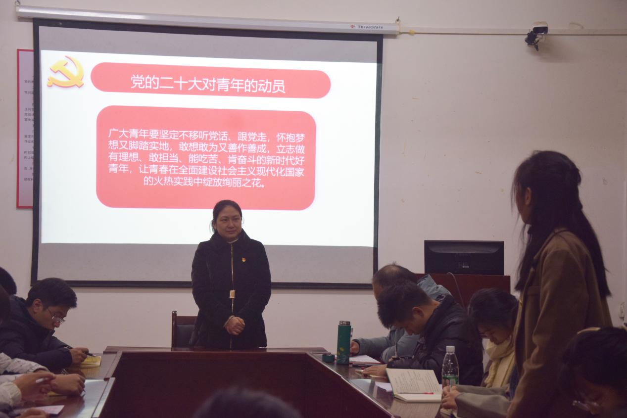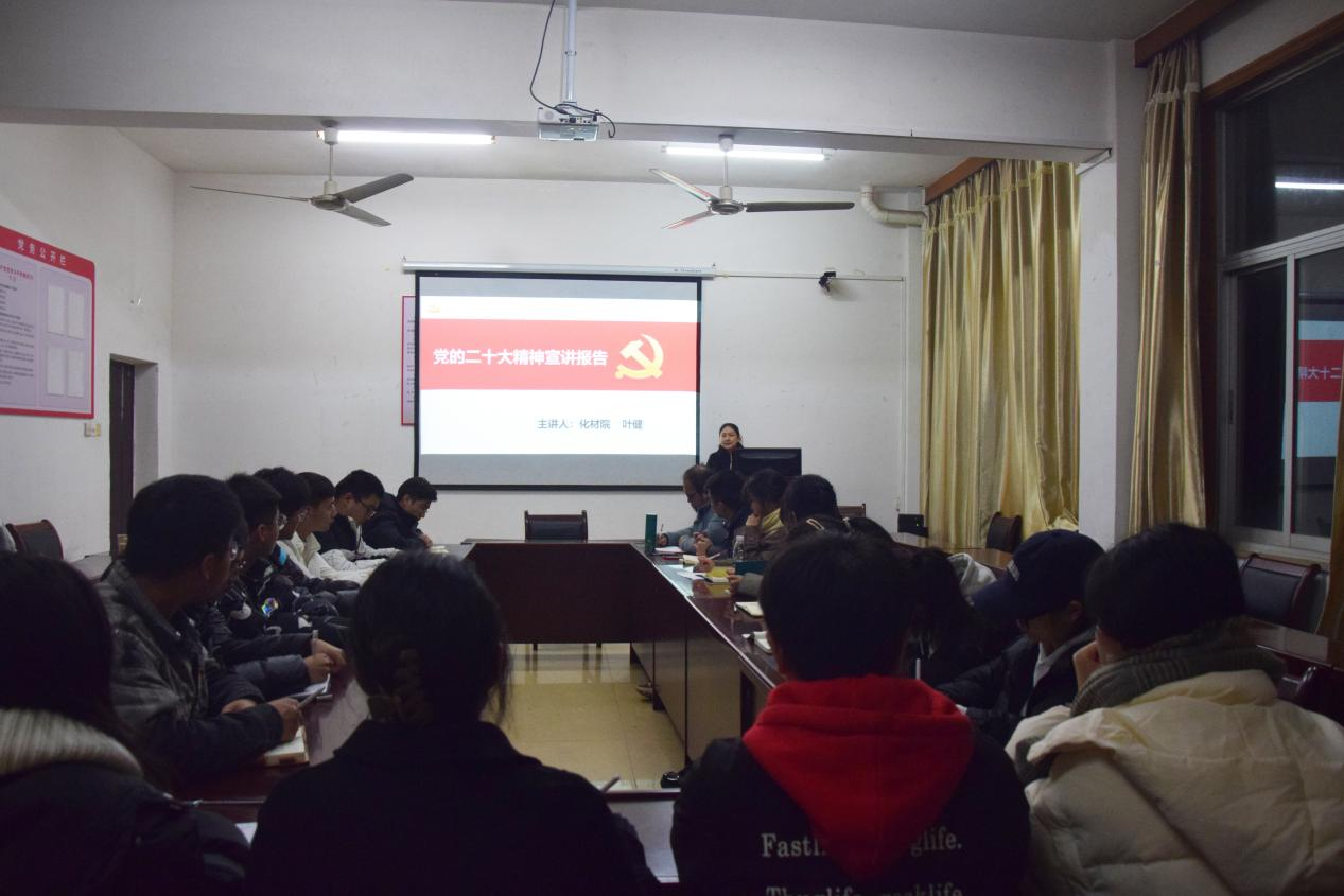 为了让大学生党员更好地学习领会党的二十大精神,2022年12月6日18:30,学院党委副书记叶健在院办212室为全体本科生党员宣讲党的二十大精神。