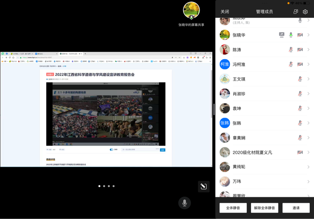 2022年11月29日,为认真贯彻落实习近平总书记关于学风建设和科研诚信建设工作以及研究生教育工作指示精神,引导广大师生和科技工作者弘扬科学家精神,beat365官网研究生支部和研究生分会共同组织研究生在线上观看“2022年江西省科学道德和学风建设宣讲教育报告会”。此次活动由学术部2022级研究生熊欣婷主持,研究生支部张晓华老师及十余名研究生认真观看并进行探讨。