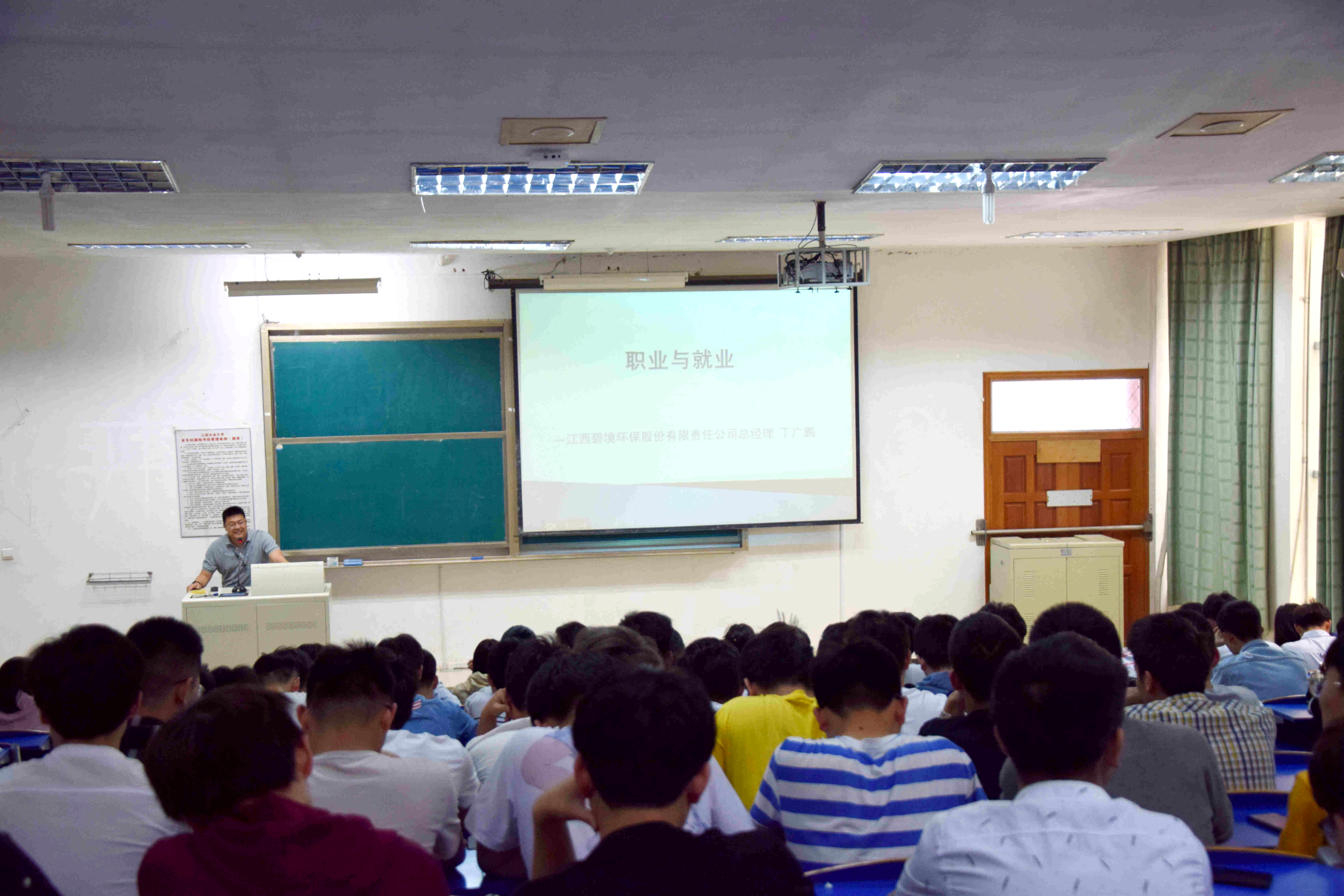 为强化学生对于职业、就业及创业的了解,进一步在学院浓厚就业氛围,5月11日下午,beat365官网优秀毕业生,应化022班校友,现江西碧境环保科技股份有限责任公司总经理丁广鹏于二教106为beat365官网2016级全体学生做了一场主题为“职业与就业”的专题讲座,讲座由学工办指导老师廖超主持。