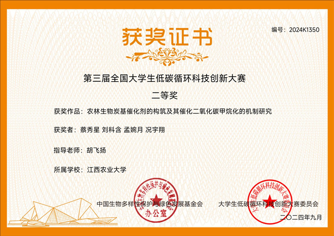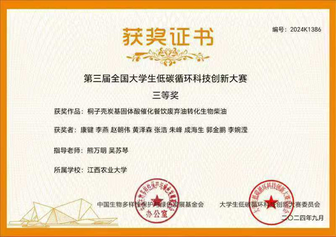 《农林生物炭基催化剂的构筑及其催化二氧化碳甲烷化的机制研究》获二等奖,团队成员有蔡秀星、刘科含、孟婉月、况宇翔,指导老师为胡飞扬、龚磊老师;《桐子壳炭基固体酸催化餐 饮废弃油转化生物柴油》获三等奖,团队成员有康键、李燕、赵朝伟、黄泽森、张浩、朱峰、成海生、郭金鹏、李婉滢,指导老师为熊万明、吴苏琴老师。本次比赛经初赛网络评审和决赛现场答辩等多个环节。