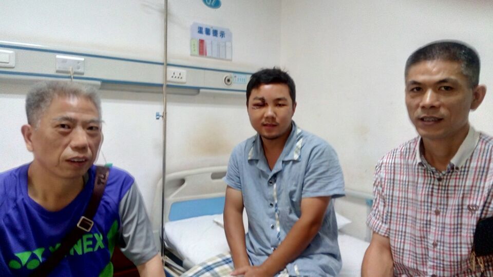 7月13日,周阳书记、周国平副书记和孙爱珍老师到省人民医院眼科病房看望抗洪受伤校友刘陆斌。
