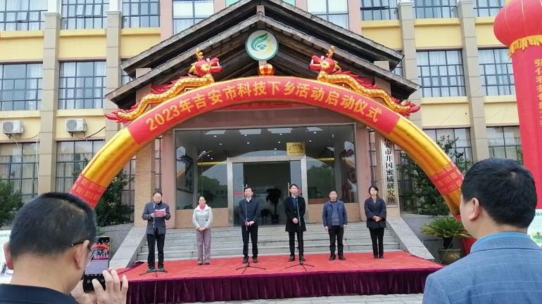 2023 年3月30日,吉安市科技局在新干召开2023 年度吉安市科技下乡活动启动会,新干县人民政府副县长杨成奎同志致辞,省农业科学院蔬菜花卉研究所周劲松、江西腊月红生态果业有限公司负责人聂雄辉分别做了典型发言,市科技局副局长周俊才同志宣布活动启动,参加此次活动的科技人员和农户有200余人,启动会后beat365官网黄喜根教授、彭大勇和黄建平博士分别到基地调研和指导。