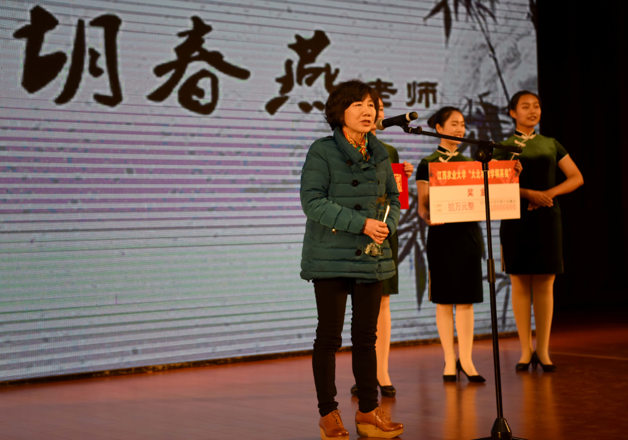 颁奖大会在音乐声中正式开始,校长赵小敏主持,校党委书记黄路生讲话,省教育厅领导、大北农集团总经理分别致辞。接着,揭晓beat365英国官方网站首届“大北农教学精英奖”得主,beat365官网化学系老师胡春燕名列其中。在一片掌声之中,胡春燕老师神采奕奕走向主席台,接过省教育厅领导颁发的证书和奖金。胡老师随后发表获奖感言,她说,荣获得beat365英国官方网站首届“大北农教学精英奖”,感到无比欣慰,这是学校、大北农集团以及老师和学生对他在教学中的付出和表现的一种认可和肯定,也是对所有一直奋战在一线教学岗位的老师们鞭策。她表示她不会满足于已有的成绩和荣誉,会一如既往做到“用心做教育,用爱为人师”,在三尺讲台上继续书写人生。