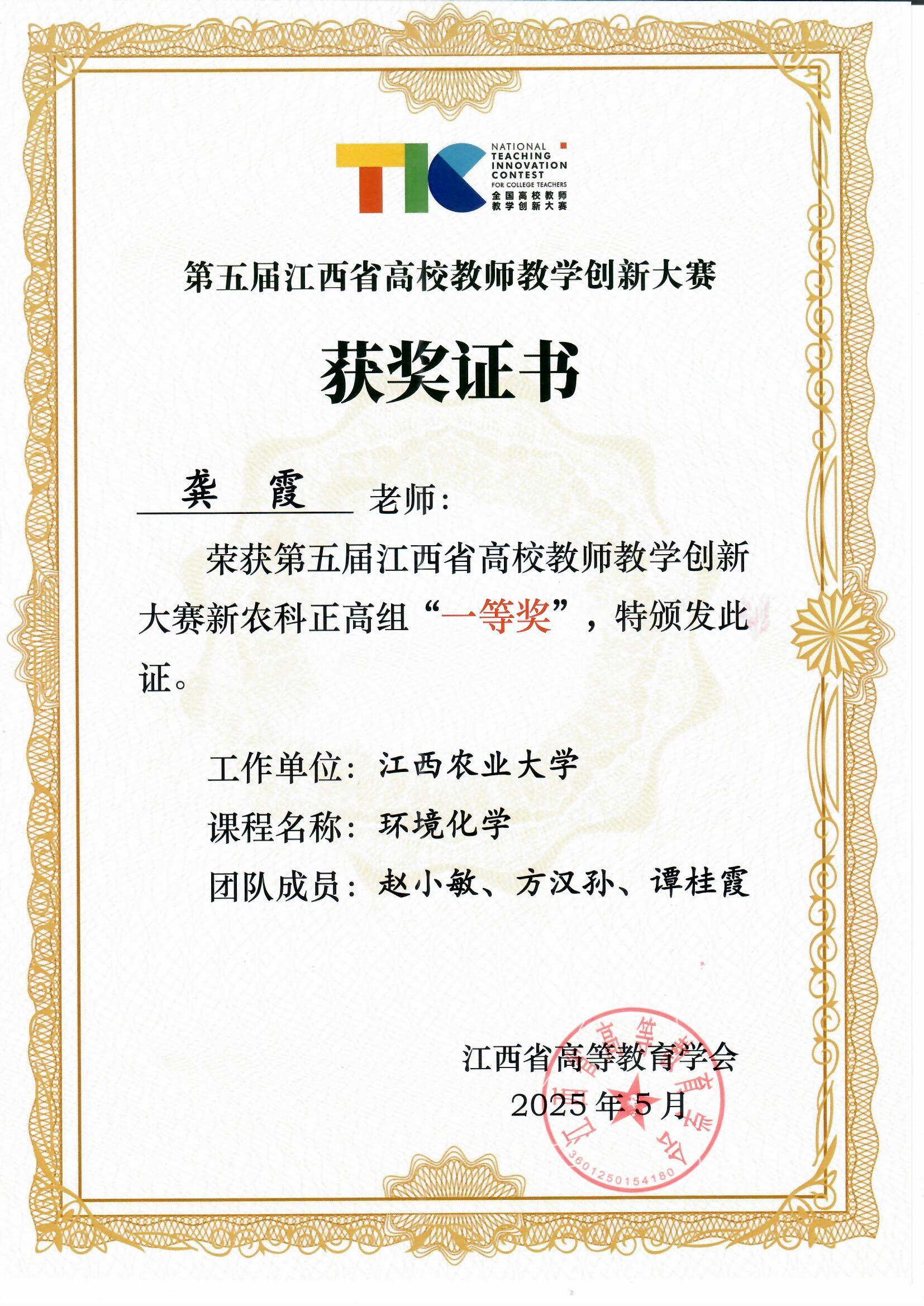 2025年5月,江西省第五届高校教师教学创新大赛结果揭晓,beat365官网龚霞教授“环境化学”教学团队荣获新农科正高组一等奖。