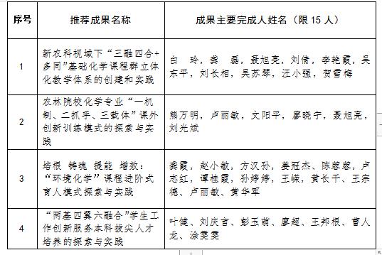 根据《关于开展2022年江西省教学成果奖评选表彰工作的通知》(赣教师字〔2022〕25号)文件要求,经过项目团队申请,学院审核,拟对以下4项教学成果推荐至学校参加评审,现将推荐名单予以公示。