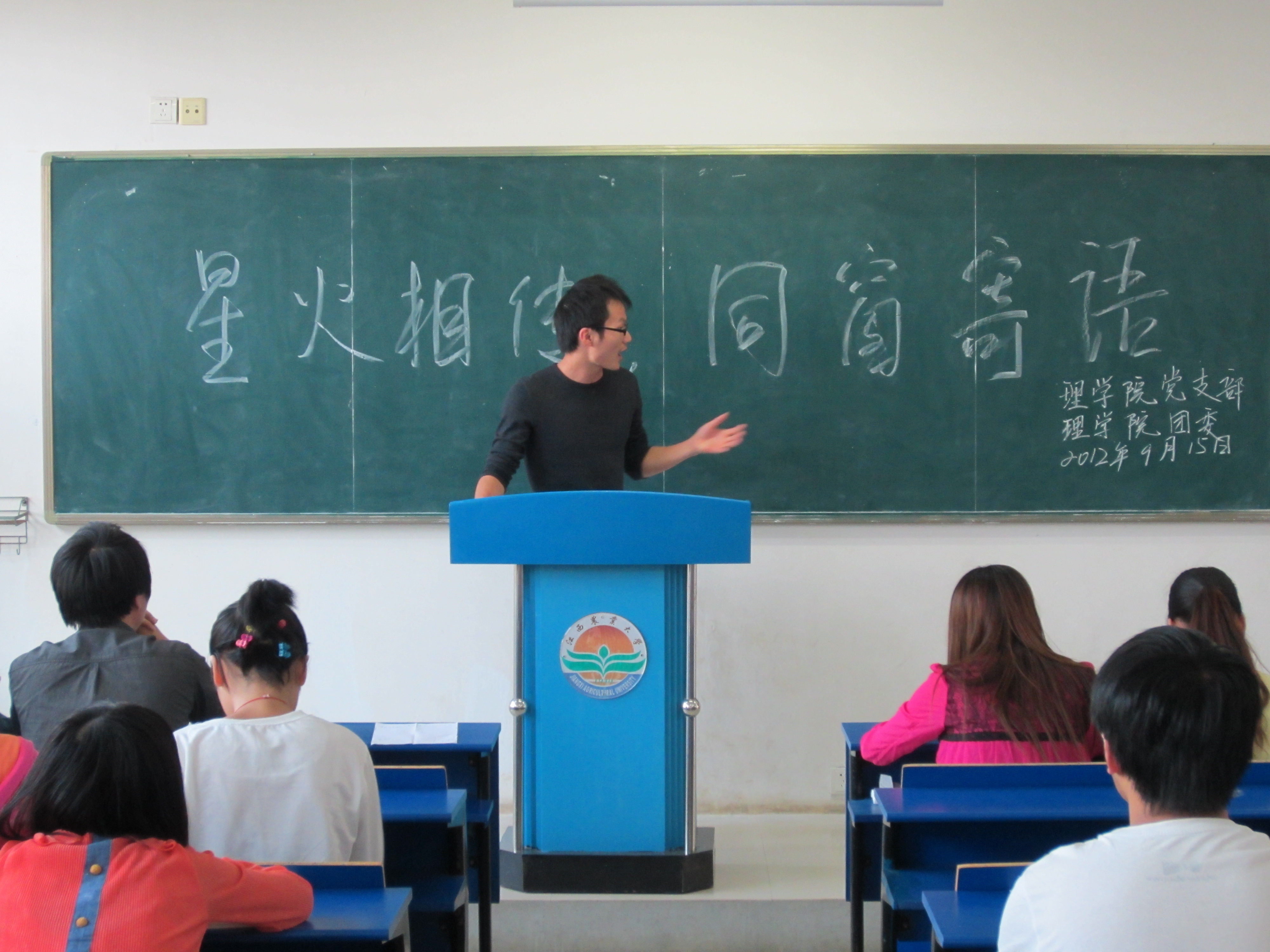 15日下午2:30,由理学院学生党支部主办,理学院团委承办的2012级新老生交流会在第五教学楼火热进行。