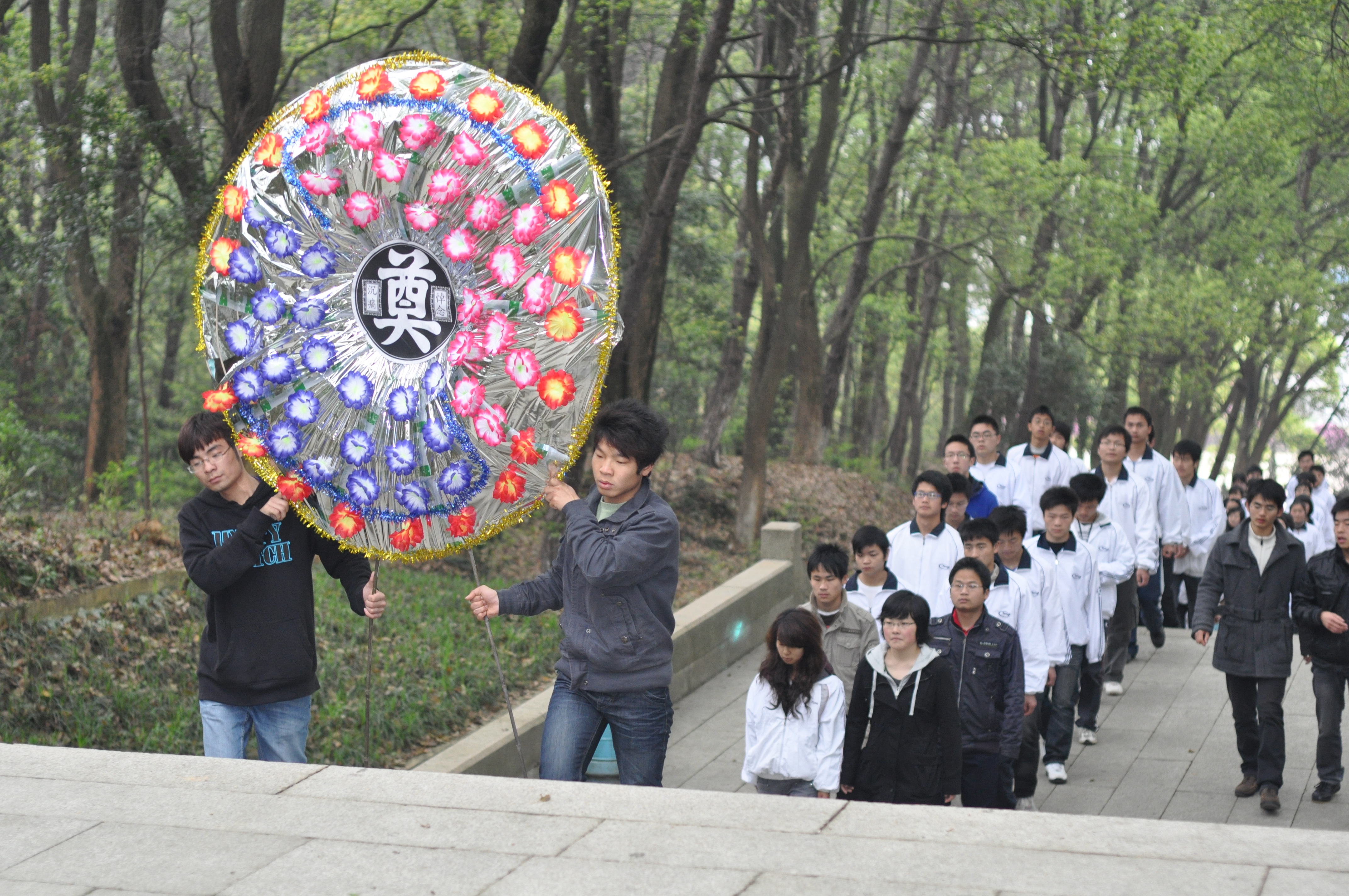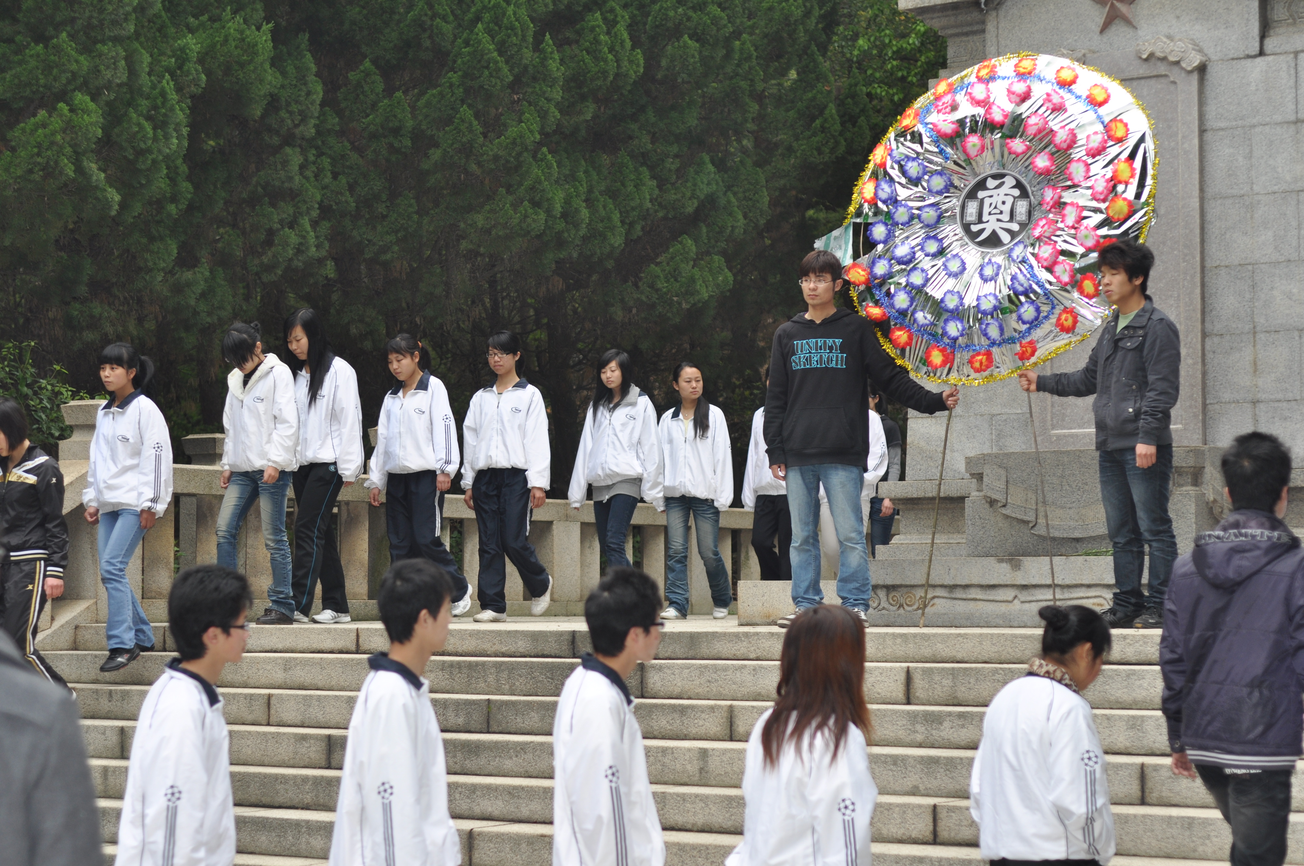 穿过苍松翠柏掩映的长阶,我们来到了方志敏陵墓前,全体人员站成方队默哀三分钟,共同体味先烈往昔的峥嵘岁月;全体党员在墓前举起右手,庄严宣誓,句句庄重的誓言响彻烈士陵园,表达对党的热爱与忠诚;周书记在墓前作了讲话,引导当代大学生要牢记历史,传承“井岗”精神,做到知荣明耻,提高综合素质,为构建平安校园、和谐江西奉献才智,为中华民族的复兴勇担责任和义务。接着,大家自发地打扫了墓园。最后,全体人员还参观方志敏英雄纪念馆。