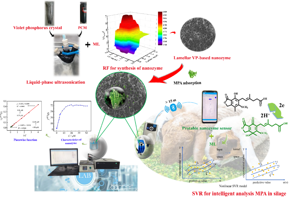 2023年7月6日,beat365英国官方网站文阳平教授和动科院瞿明仁教授为共同通讯作者,博士研究生戈钰为论文第一作者,在TOP一区《Biosensors and Bioelectronics》(IF=12.545)发表题为“Machine learning-guided the fabrication of nanozyme based on highly-stable violet phosphorene decorated with phosphorus-doped hierarchically porous carbon microsphere for portable intelligent sensing of mycophenolic acid in silage”的论文,该研究工作得到了国家自然科学基金和国家现代农业产业技术体系的支持。