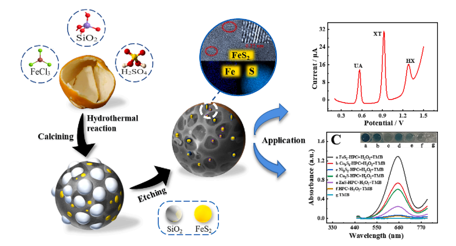 为了实现三种嘌呤代谢物的快速检测,本研究应用农林废弃生物质(橙子皮海绵层)为碳源,过渡金属氯化物为金属源,硫酸为硫源,二氧化硅胶体为硬模板,通过原位水热法成功制备了不同过渡金属硫化物修饰的分级多孔碳(FeS2-HPC、 Co9S8-HPC、 Ni3S2-HPC、Cu2S-HPC和ZnSHPC),并利用FeS2-HPC建立了具有多种类酶活性且可同时检测三种嘌呤代谢物的电化学传感平台。尿酸在0.3-200μM的线性范围内最低检测限为0.069μM,黄嘌呤在0.3-100μM的线性范围内最低检测限为0.047μM,次黄嘌呤在0.7-300μM的线性范围内最低检测限为0.21 μM。本研究建立了一种基于农林废弃物生物质制备金属硫化物功能化分级多孔碳的通用方法,为生物质多孔碳的结构调控和过渡金属硫化物的制备提供了理论支撑,同时也为利用具有多种酶样活性的生物质多孔碳作为电化学传感器用于人体健康评价和疾病预防提供了理论指导和实验支持。