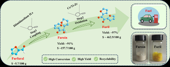 本文提出了一条两步法的策略以实现糠偶酰的绿色高效合成,即先经双咪唑离子液体催化糠醛偶联合成糠偶姻,随后进一步通过双金属氧化物Ce/TiO2-ZrO2催化氧化糠偶姻合成糠偶酰。
