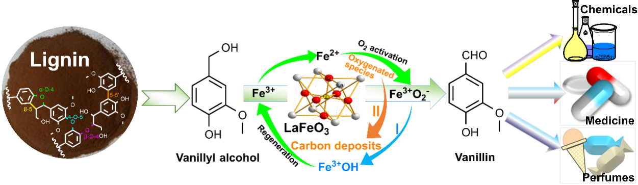 本论文基于钙钛矿氧化物具有高氧迁移率、高稳定性、低成本和优异的氧化还原性能等优点,构建了高效且可重复使用的稀土LaFeO3钙钛矿在无碱绿色条件下催化氧化木质素基香草醇以生产香草醛。通过对催化剂用量、反应时间、反应温度和O2压力进行优化及溶剂效应的考察,于最佳条件下可实现100%的香草醇转化率和33%的香草醛产率。在此基础上,对LaFeO3钙钛矿进行了循环使用测试并揭示了其在催化氧化香草醇过程中的活性位点和催化作用机理。总之,我们这项研究工作可为后续构建稀土LaFeO3基钙钛矿作为生物炼制木质素生产香草醛的高效和可重复使用的催化剂提供了一种可扩展、绿色和可持续的策略。