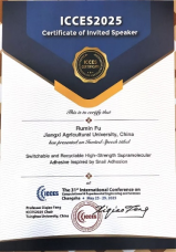 beat365官网材料化学教研室付如民青年教授受邀参加S82. Bio-Inspired Smart Surfaces for Advanced Applications分会场并做了题为《Switchable and Recyclable High-strength Supramolecular Adhesive Inspired by Snail Adhesion》的主题报告,系统地介绍了智能粘合剂的研究意义和难点,提出了新型界面物理/化学键合协同模量变化对可逆粘附的影响,并探究了其高透明性和可回收性等多功能性,最后就其在柔性电子和智能家居的应用与同行专家进行了深入广泛的交流,对于宣传beat365官网材料化学领域的最新学术进展起到了良好的效果。