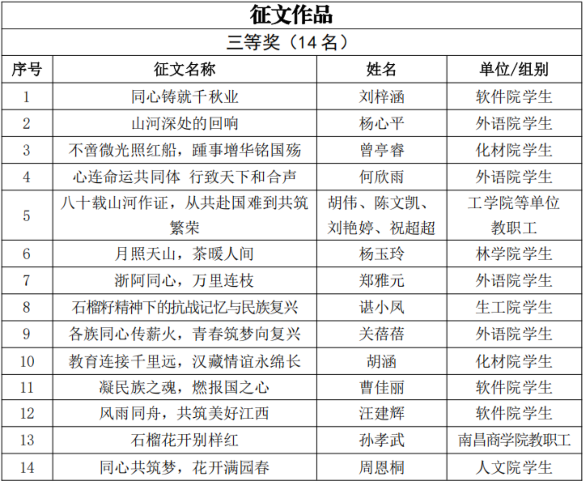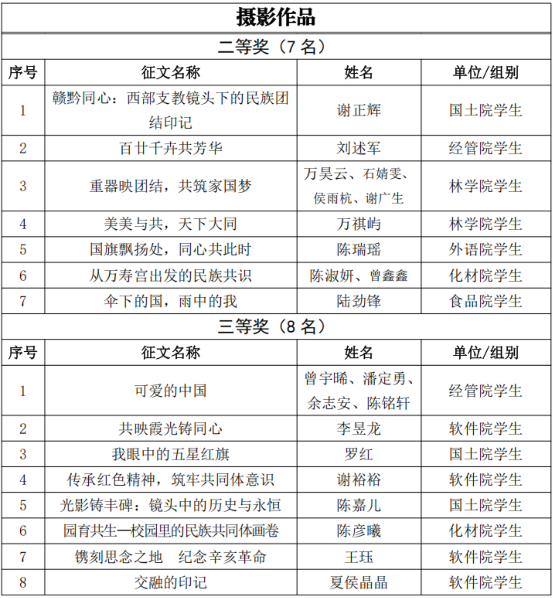本次大赛旨在以文字和镜头为载体,引导青年学子深化对中华民族共同体意识的理解与认同。应化2402班陈淑妍、曾鑫鑫的摄影作品《从万寿宫出发的民族共识》荣获二等奖;材料2401班陈彦曦的摄影作品《园育共生—校园里的民族共同体画卷》,应化2401班胡涵的征文作品《教育连接千里远,汉藏情谊永绵长》、材料2302班曾亭睿的征文作品《不啻微光照红船,踵事增华铭国殇》获三等奖。
